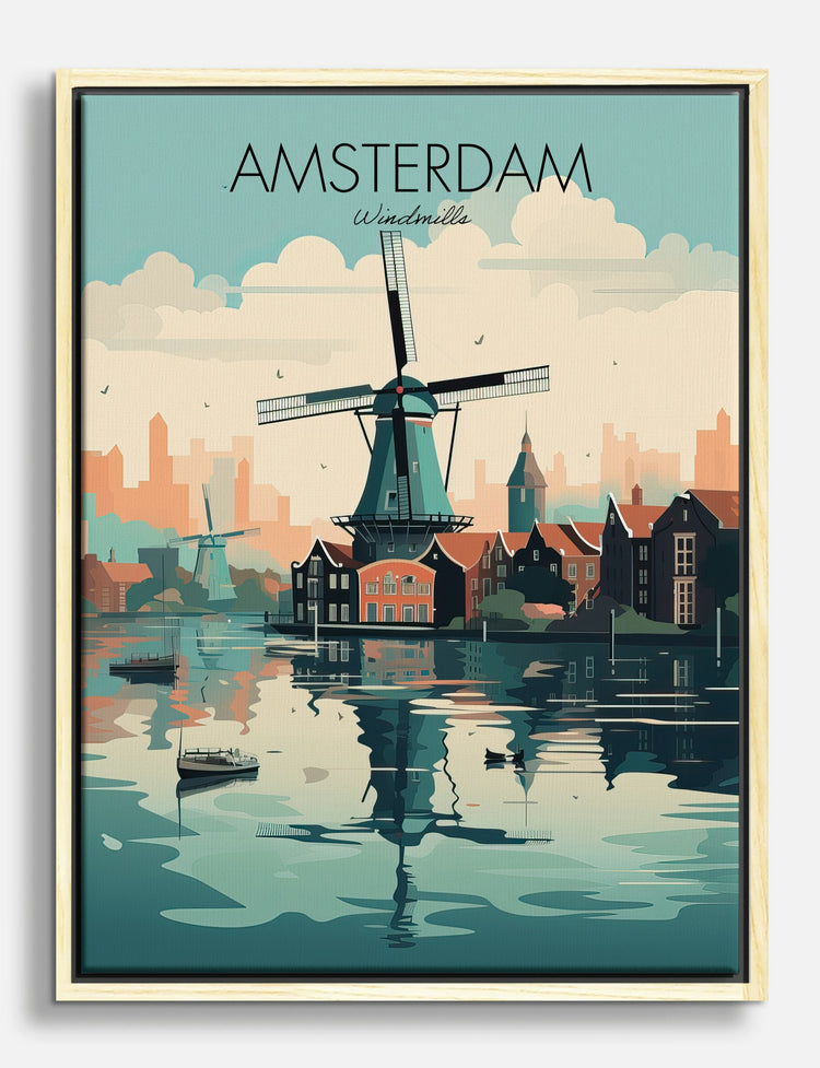 A bold silhouette of a classic windmill rises above tranquil waters, infusing your space with a sense of adventure and timeless charm. This piece brings the spirit of Amsterdam right into your home, blending rich blues and warm terracottas for a look that’s both soothing and sophisticated.