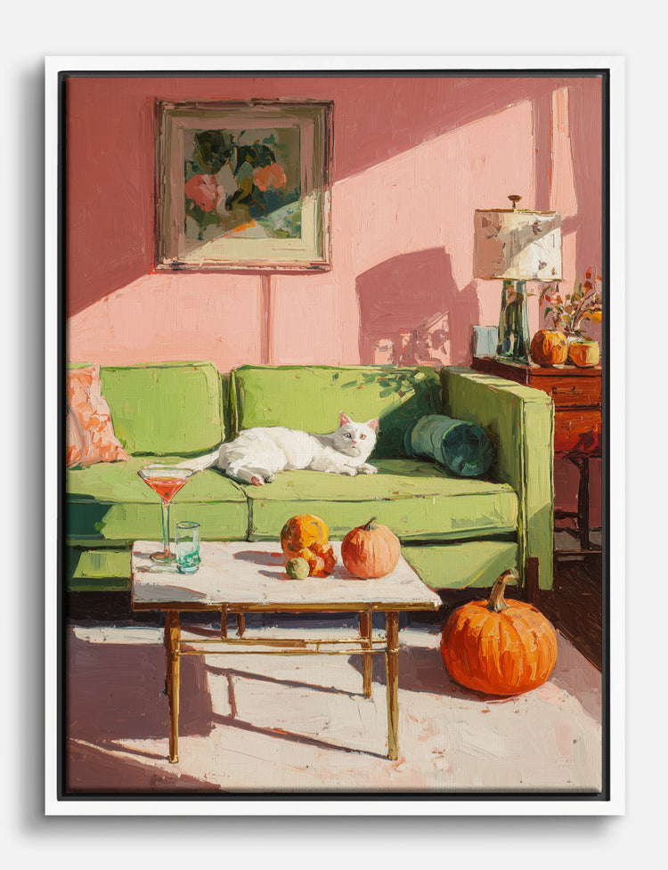 Sunlight spills across a cozy living room, where a snowy white cat claims center stage on a vibrant green sofa—pure serenity in a single glance. There’s a gentle, welcoming energy here, punctuated by cheerful orange pumpkins and a martini glass that hints at relaxation and celebration.