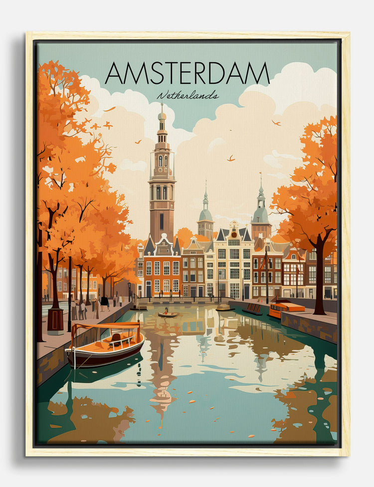 Crisp autumn air and golden leaves set the scene for your next style upgrade. This inviting Amsterdam canal view captures the cozy charm of fall in the city, making any room feel instantly more welcoming and cultured. The warm oranges and soft blues are perfect for adding a pop of color to your living room or study—no passport required.