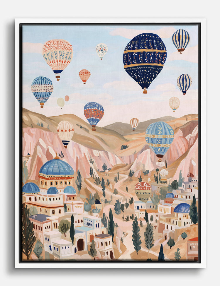A sky full of hot air balloons drifts above a sun-washed village, inviting wonder into your everyday. This print brings a playful sense of adventure to your walls—perfect for anyone craving that feeling of freedom and wide-open possibility.