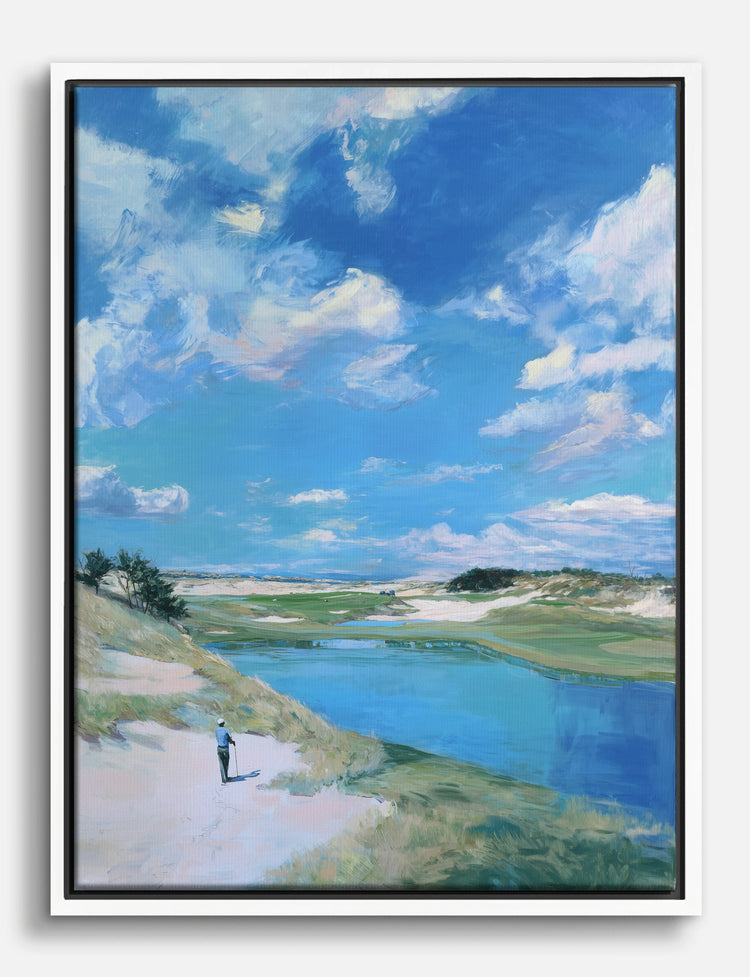 Wide-open skies and rolling greens—this piece brings the fresh, invigorating spirit of the outdoors right into your home. The sweeping clouds and serene water invite you to pause, breathe deep, and let your mind wander.