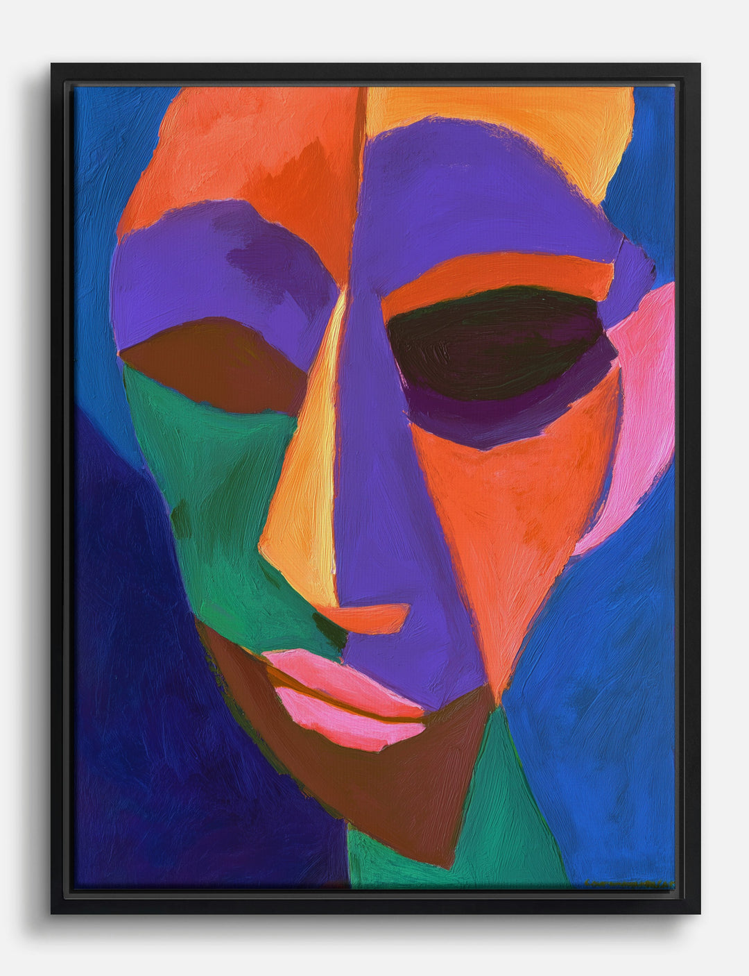 Vivid blocks of orange, purple, and green come together in a face that’s anything but ordinary. This piece instantly energizes your space with its fearless palette and abstract form, inviting conversation and sparking curiosity.