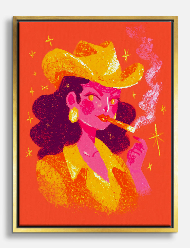 Feel the thrill of pure confidence radiate from your walls with this vibrant, sassy cowgirl portrait. Drenched in sizzling oranges, hot pinks, and golden yellows, this print instantly energizes any space—like a spark of self-assurance you can see.
