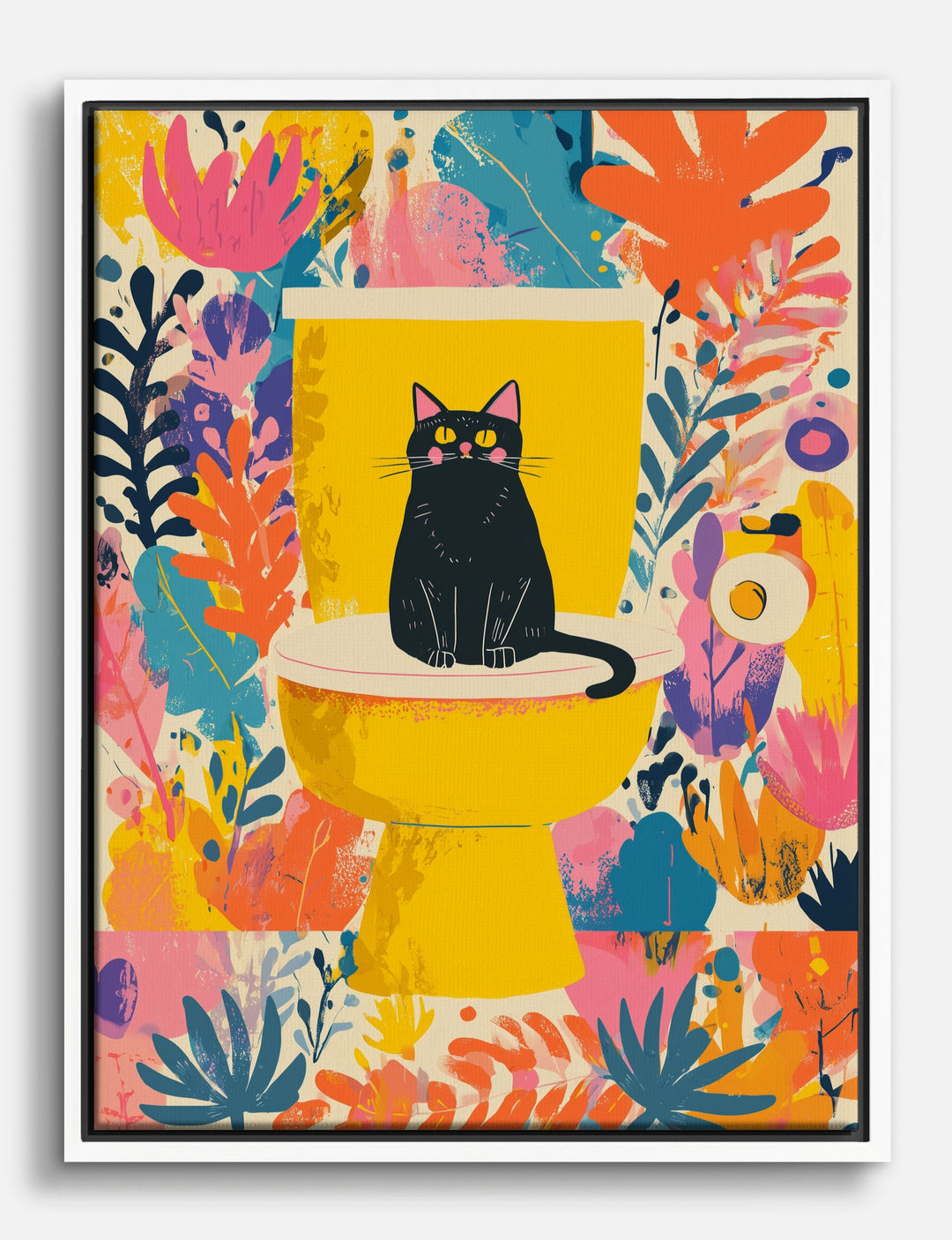 Who says bathrooms cant be fun? This playful piece bursts with botanical energy, featuring a charismatic black cat perched atop a sunny yellow toilet—surrounded by a riot of colorful, abstract florals. It’s an instant mood-lifter, ready to spark smiles and conversation every time you walk in.