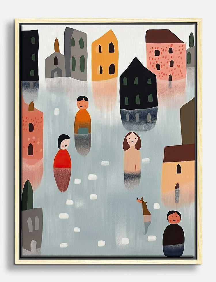 Ever wondered what quiet wonder feels like? This playful cityscape brings a gentle sense of curiosity to your walls, with softly colored houses floating above dreamy water and tiny, expressive figures inviting you in. The muted palette of blush, charcoal, and golden ochre works beautifully in both living rooms and bedrooms, complementing modern or eclectic decor. Youll love how this piece turns any corner into a space that feels personal, stylish, and unmistakably yours.