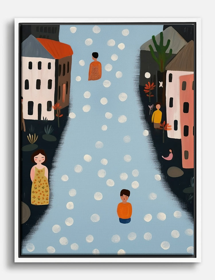 A gentle river winds through whimsical city blocks, dotted with tiny figures and soft pastel hues. This piece brings a playful, modern touch to your space—perfect for sparking joy in your living room or adding personality to a bedroom. The muted blues and earthy pinks blend effortlessly with both bold and neutral palettes, making it easy to refresh your style. Let your walls tell a story of everyday wonder and urban calm—because transforming your home should always feel this inviting.