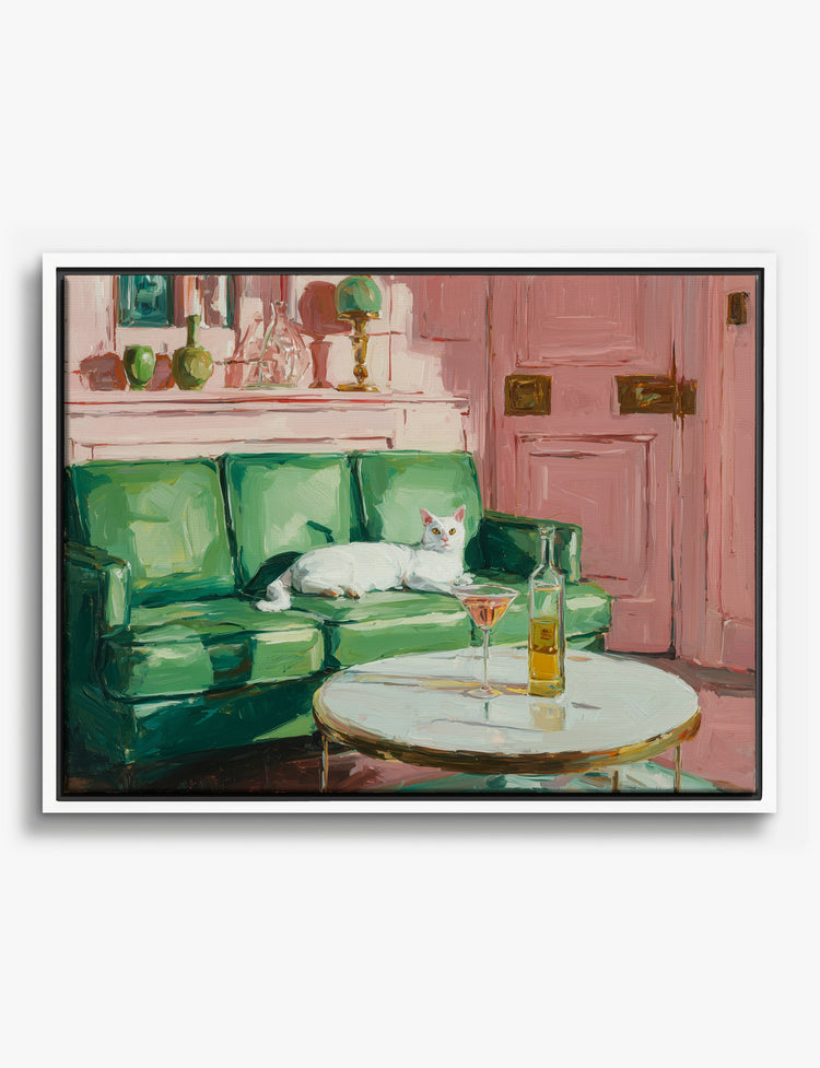 A white cat lounges with effortless grace on a lush green sofa, bringing a sense of laid-back luxury to your space. This scene radiates cozy sophistication—think cocktail hour, but make it chic and feline-approved. Let this artwork instantly elevate your living room or bedroom, inviting playful charm and a dash of retro flair. The rich greens and soft pinks make it a perfect match for both bold and neutral palettes, so you can refresh your style without a single renovation. Every time you walk by, you’ll feel a little more relaxed, a little more inspired, and a lot more proud of your uniquely personal space. Because the best homes feel both stylish and lived-in—just like this moment.