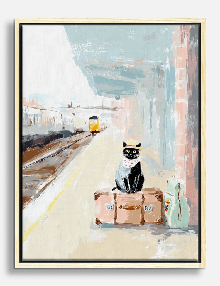 A poised black cat waits atop vintage suitcases, ready for its next big adventure. This playful scene turns any wall into a story, sparking curiosity and wanderlust every time you pass by.
