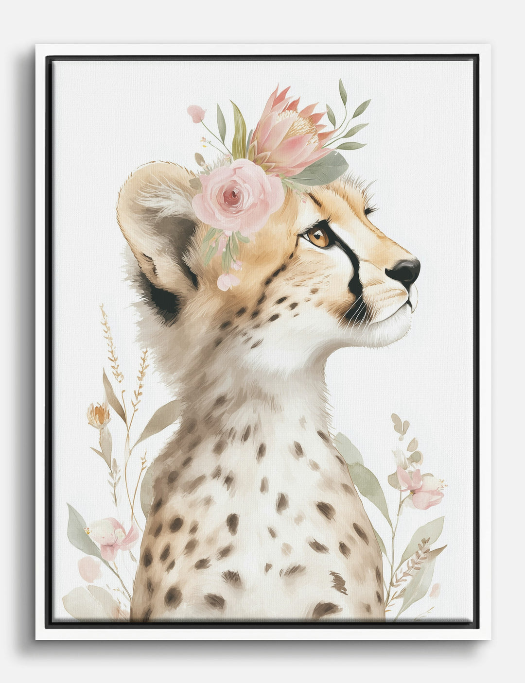 A gentle gaze, a crown of soft petals—this cheetah brings a touch of wild grace to your space. The watercolor style and blush-pink florals create a calming vibe that feels right at home in a nursery or bedroom.