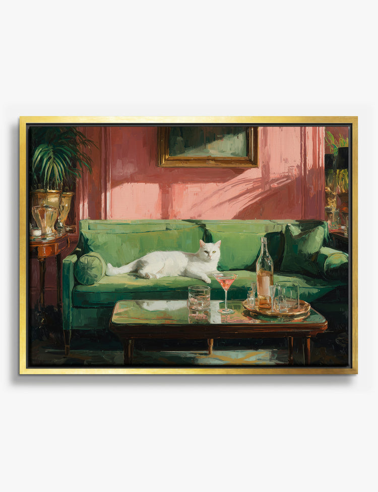 Who says luxury can’t be playful? This scene brings instant character to your walls, starring a poised white cat lounging on a lush green sofa—cocktails at the ready. The sunlight dances across pink walls, making the space feel warm and inviting, like your own personal hideaway. It’s the kind of piece that sparks smiles and conversations, perfect for your living room or a cozy reading nook. The vibrant green and blush tones pop against both modern and vintage décor, giving your space a boost of effortless style. Let this print be your daily invitation to unwind, celebrate the little moments, and express your unique taste. Transform your home into a space you’re proud of—where comfort and personality shine.