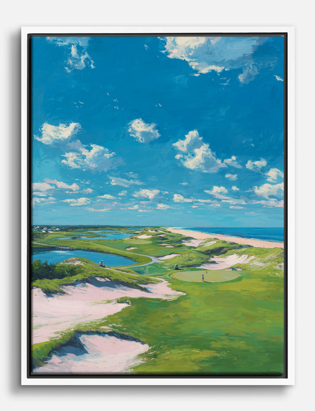 Blue skies stretch endlessly above rolling greens and sandy dunes, inviting a breath of fresh air into your space. This piece captures that unmistakable feeling of freedom—like a perfect day spent outdoors, where the world feels open and full of possibility.