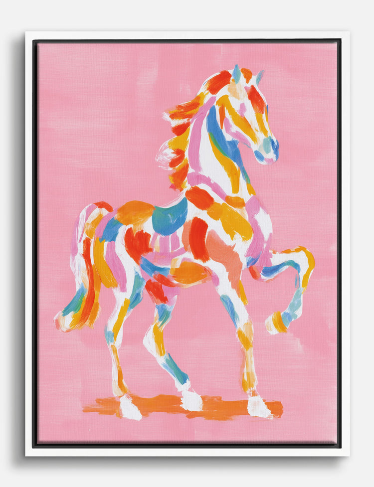 Bold, joyful, and utterly unique — this prancing horse brings instant personality to any room. Splashes of vibrant color dance across a playful pink backdrop, making it impossible not to smile.
