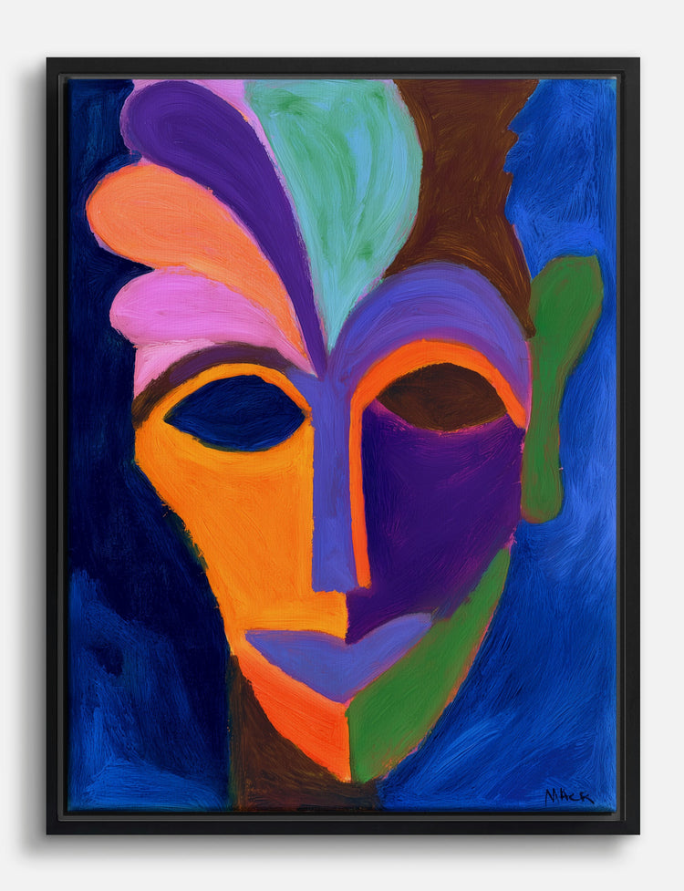 Bold shapes and electric colors make this piece a true conversation starter. It’s all about fearless self-expression—perfect for anyone ready to energize their space and show off their unique style. The vibrant palette of oranges, purples, blues, and greens creates instant impact, whether you hang it in your living room or bring life to a modern office.