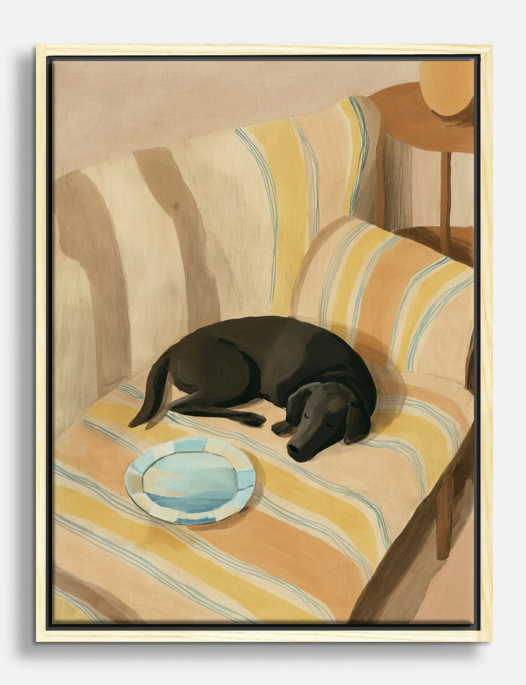 A gentle hush falls over your space with this heartwarming scene—where a loyal black dog curls up on sunlit stripes, embodying the art of true relaxation.