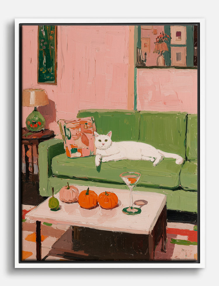 A white cat lounges like royalty on a fresh green sofa — this is more than a scene, it’s pure, effortless comfort for your walls. Instantly, your living room feels lighter, brighter, and filled with personality.