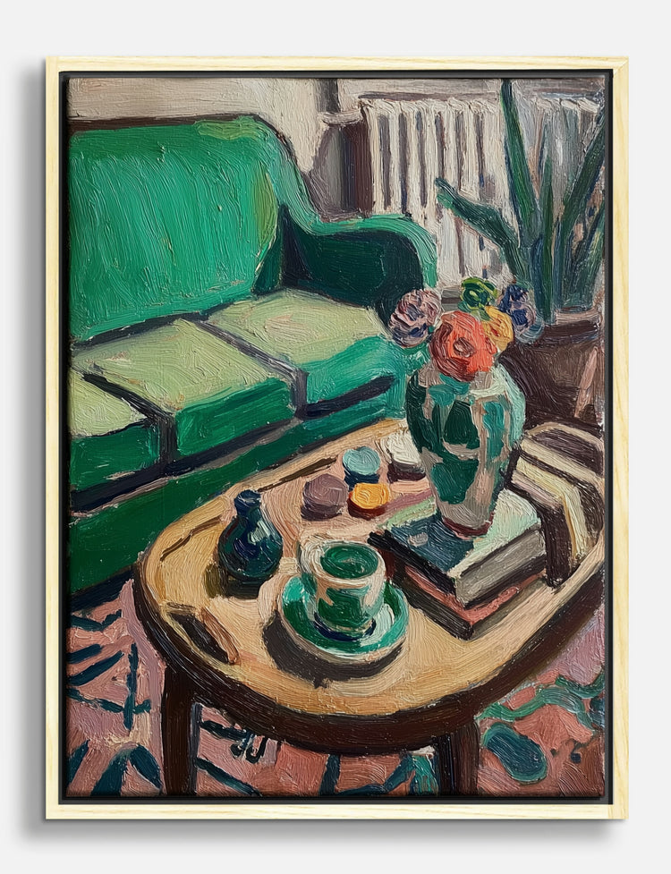 Bold, fresh, and full of character—this piece instantly energizes any space. Lush green tones from the sofa spill into the scene, inviting you to unwind with your favorite book or a cup of tea. A bouquet of flowers and charming table details bring a warm, personal touch that feels both lived-in and stylish.
