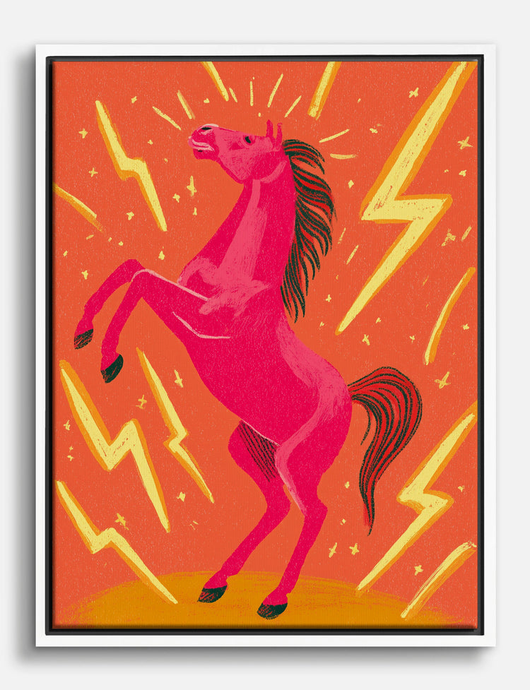 Feel the pulse of pure energy every time you walk into the room. This electrifying pink horse, bursting with wild spirit and surrounded by bolts of golden lightning, is your daily reminder to own your power and stand tall.
