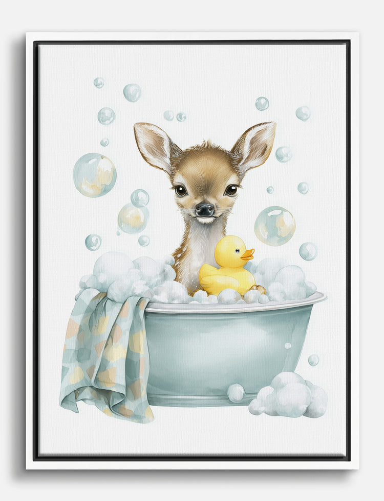 A little magic for your nursery walls: a sweet baby deer and its rubber ducky companion turn bath time into pure joy. Soft bubbles and gentle watercolor hues create a scene that’s playful yet soothing, perfect for sparking smiles every day.