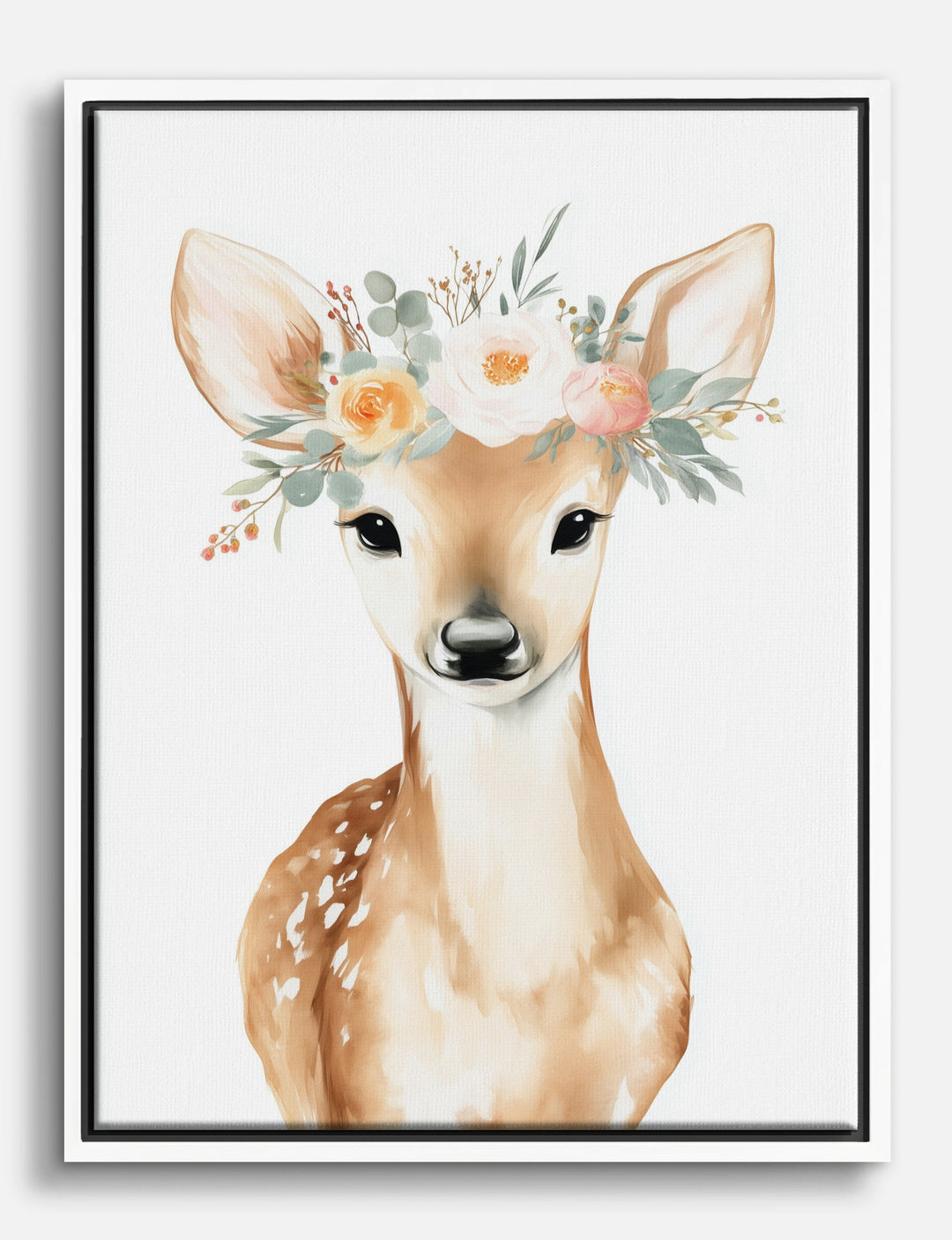 A gentle fawn, crowned with delicate watercolor blooms, brings an instant sense of calm and sweetness to your space. Soft neutrals and blush tones make this piece a natural fit for a nursery or any room that could use a touch of whimsy and warmth.