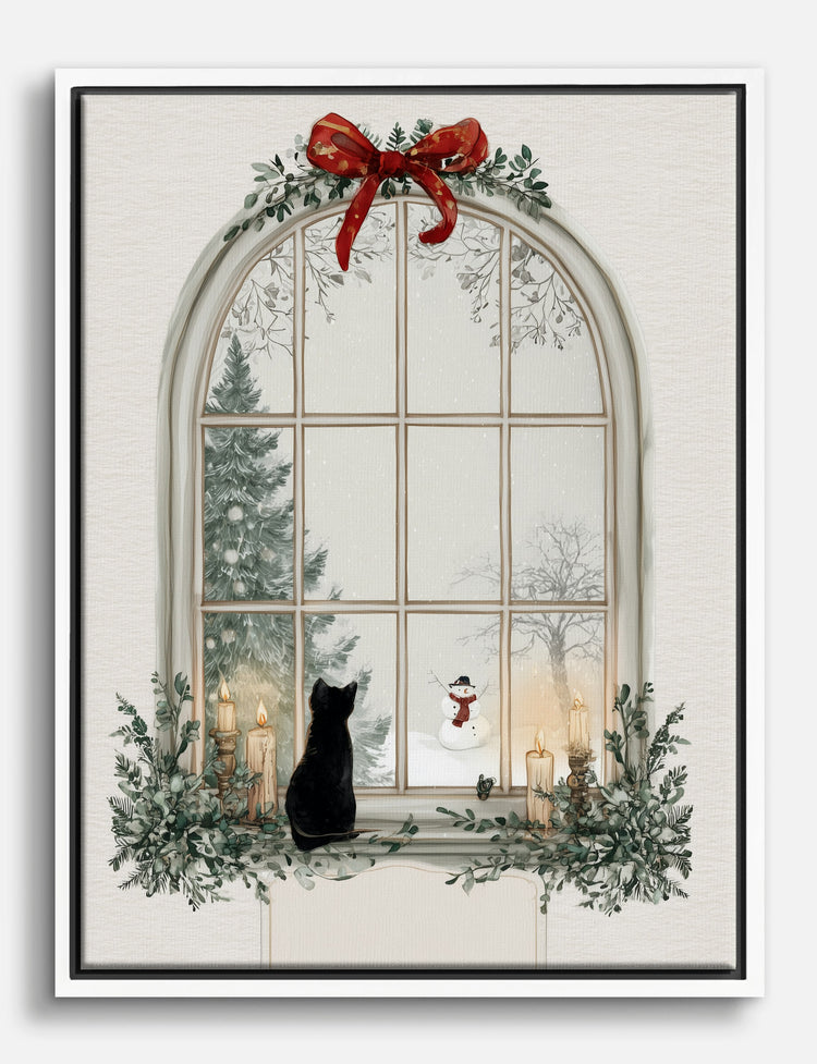 A quiet moment of wonder—your space deserves that kind of magic. Here, a curious black cat sits peacefully at a frosted window, candles aglow, gazing out at a cheerful snowman and wintry trees. The arching frame, adorned with a vibrant red bow and fresh greenery, brings a soft, nostalgic holiday spirit right into your home.