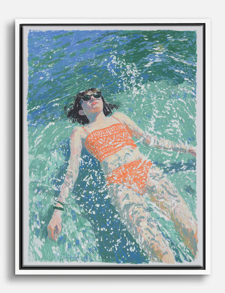 Sunlight, water, and freedom — this piece captures the pure joy of a carefree summer day. You’ll almost feel the cool, sparkling water lapping at your own skin every time you glance its way. The vibrant orange swimsuit pops against lush teal and turquoise, bringing a playful, refreshing vibe into your space. Perfect for your living room or bedroom, this print adds a touch of laid-back confidence and warmth. It’s the ideal pick-me-up for anyone craving a little more sunshine in their daily routine. Pair it with modern or eclectic décor — the bold colors and relaxed energy make it easy to style, and even easier to love. There’s no better way to show off your unique style and remind yourself to float above the rush.