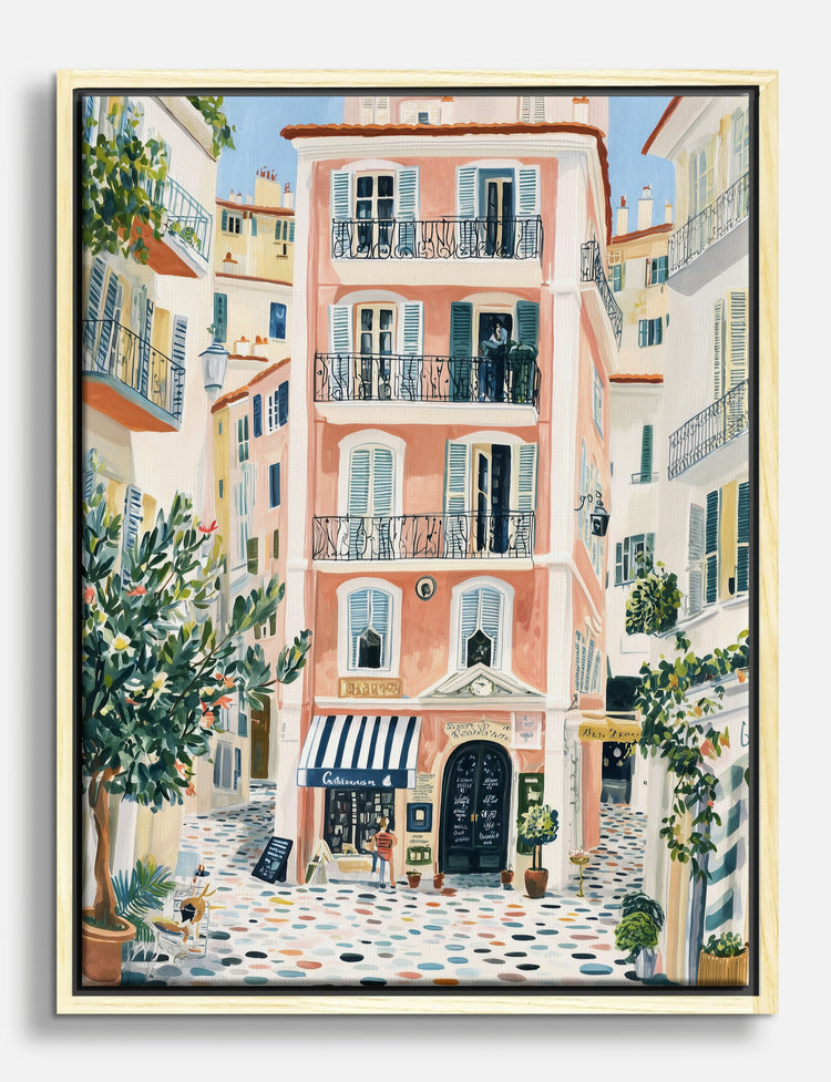 Step into the sun-drenched charm of the French Riviera every time you walk past this piece. A blush-toned building with wrought-iron balconies and striped awnings brings a touch of effortless European elegance to your home.
