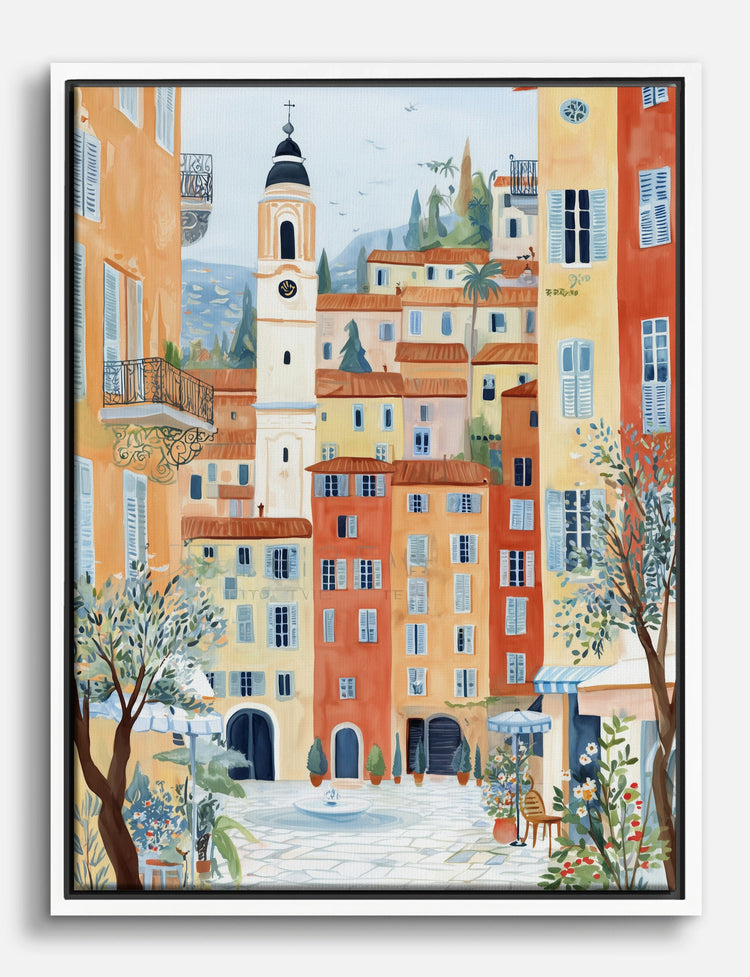 Step into the sun-drenched charm of the Mediterranean every time you walk by this piece. Soft watercolor hues of terracotta, peach, and sky blue capture the breezy romance of a hillside French village, instantly brightening your home.
