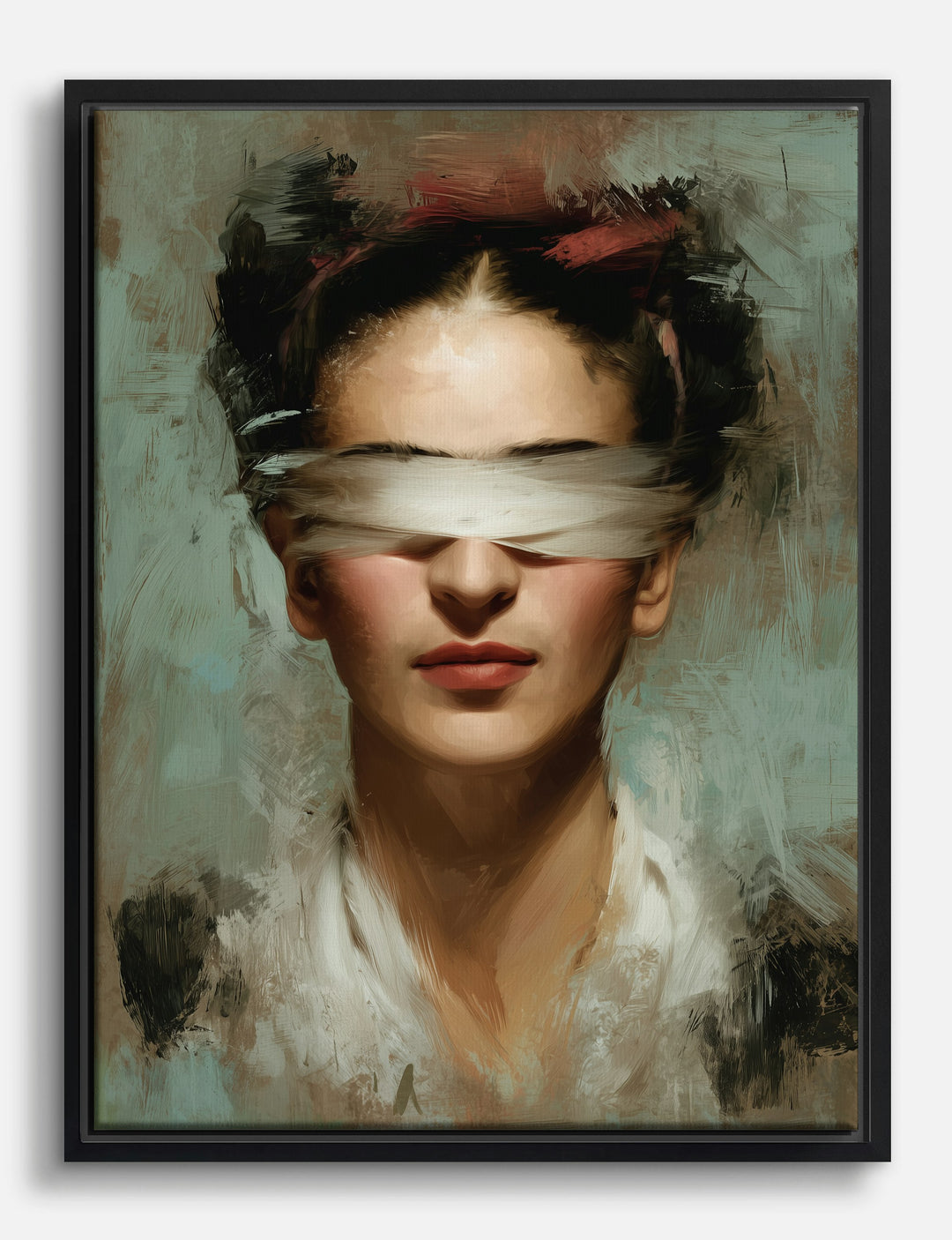 Bold, mysterious, and utterly captivating—this portrait draws you in with its striking contrast and enigmatic energy. The bandaged eyes invite you to look deeper, sparking curiosity and conversation in any space.