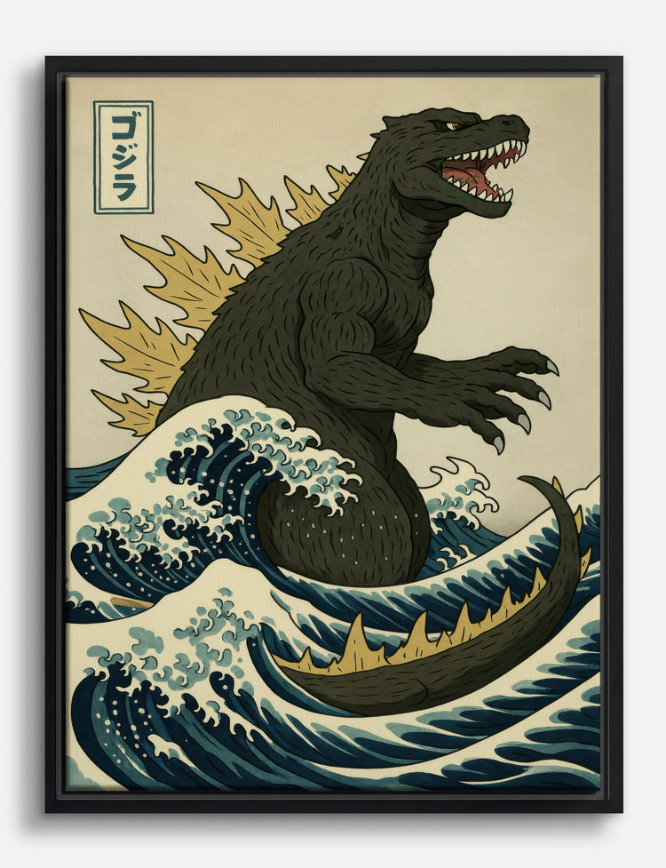 Bold, playful, and utterly iconic—this piece brings a legendary twist to your walls. Godzilla rises from stylized waves, channeling the energy of Hokusai’s famous print and filling your space with unstoppable character.