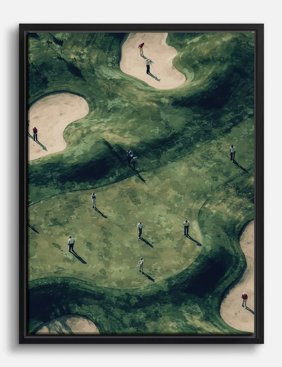 A bird’s-eye view transforms a day at the golf course into a modern masterpiece of movement and light. The scattered figures and sweeping greens bring a sense of calm energy, inviting you to pause and take in the rhythm of the game.