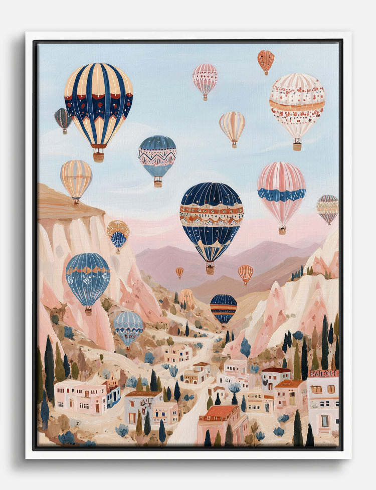 Up, up, and away—let your walls tell a story of adventure and wonder. This charming print captures a sky dotted with whimsical hot air balloons, drifting above a sunlit valley inspired by the magic of Cappadocia. Soft blush, navy, and peach hues give this piece a gentle warmth, perfect for creating a cozy, inviting vibe.
