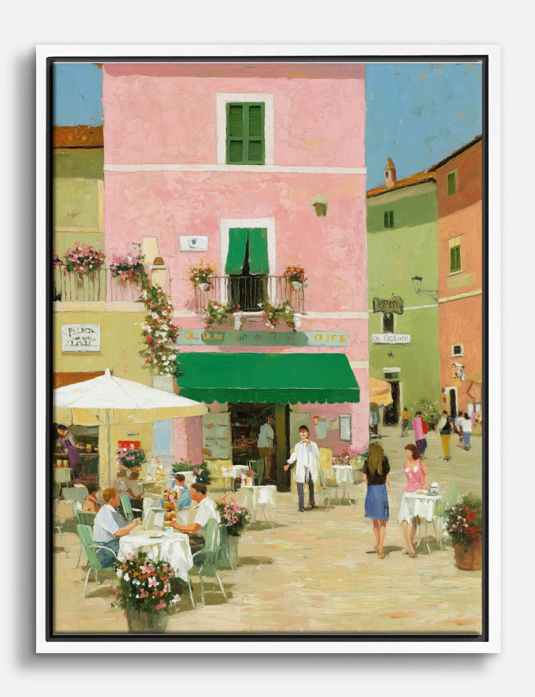 Step into a sunlit piazza every time you walk by this piece. Soft pinks and lush greens pop against a backdrop of charming Italian architecture, instantly transporting your space to a lively café scene. Whether it’s your dining room or living room, this artwork brings a burst of color and a sense of relaxed, everyday joy.