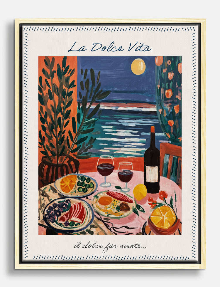 A feast for the senses, this vibrant piece brings the warmth and allure of the Mediterranean straight into your home. Lush greenery, rich sunset hues, and a table set for two invite you to savor every moment—no passport required.