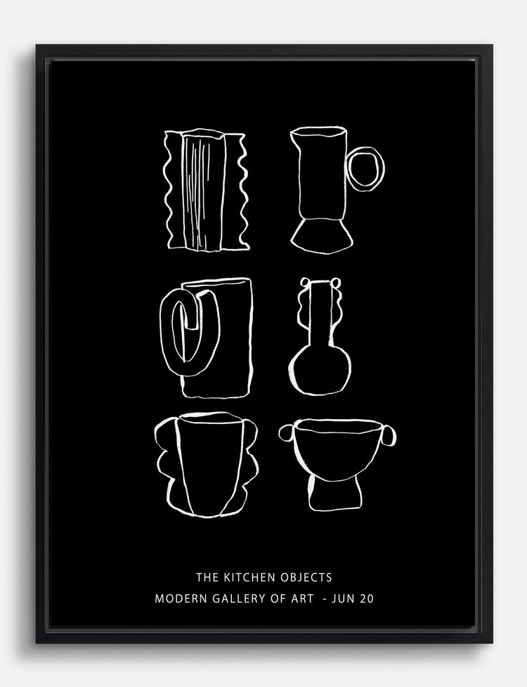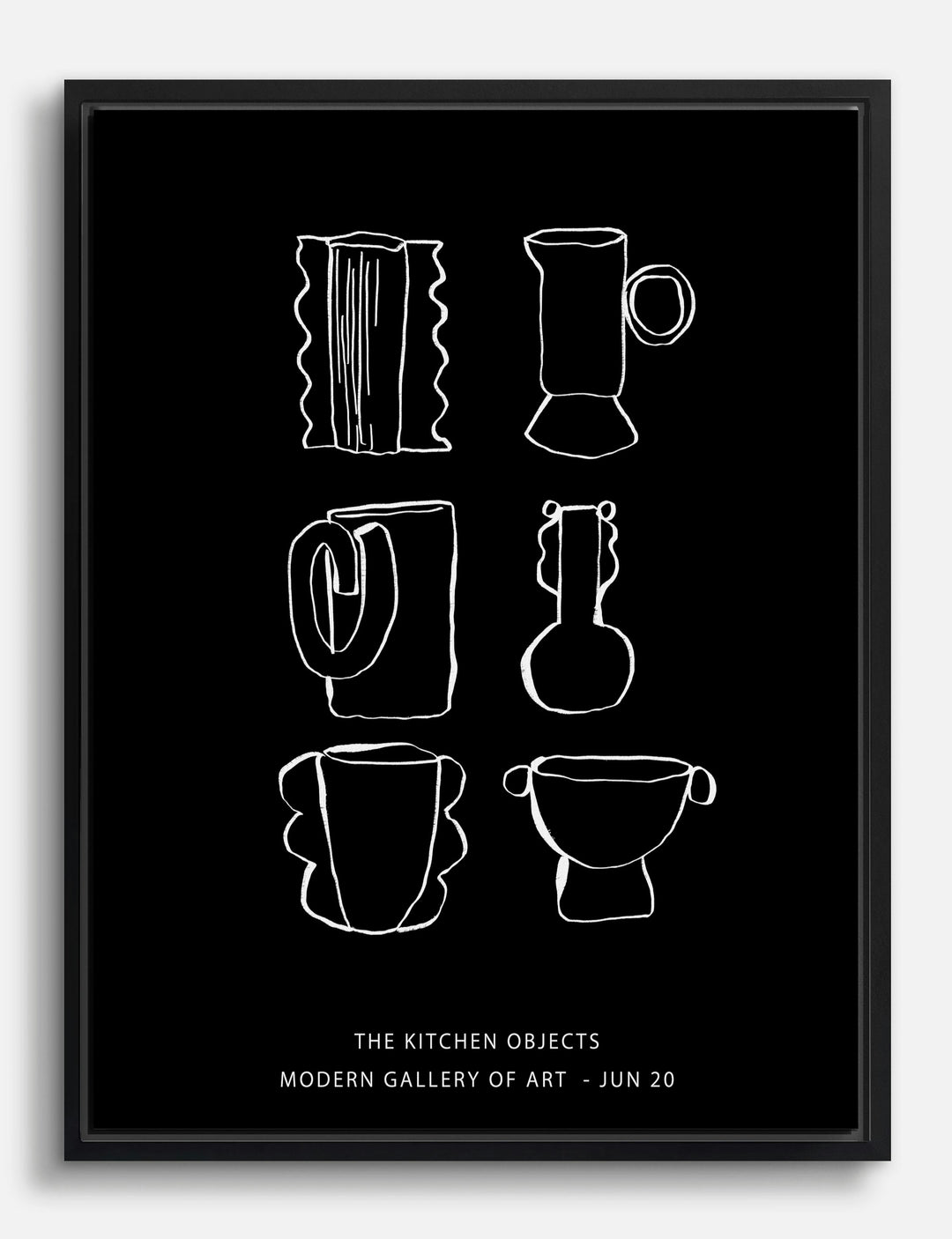 Step into modern simplicity with this playful sketch of everyday kitchen shapes. Six bold, white line drawings pop against a deep black background, turning familiar mugs and bowls into chic, sculptural statements. This piece is perfect for your kitchen or dining room, adding a dash of creative flair without overwhelming your space.