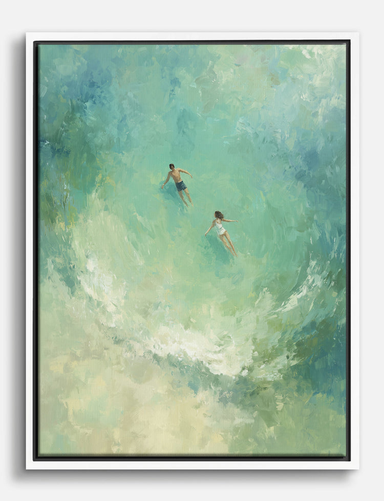 Como una brisa suave de una tarde de verano, esta obra llena tu espacio de calma y conexión. Aguas turquesas y suaves arremolinan a una pareja que deriva unida, invitándote a bajar el ritmo y saborear la belleza del momento. Ideal para dormitorio o salón, transforma cualquier pared en un refugio sereno, donde casi se escucha el rumor lejano de las olas. Su paleta ligera de verdes marinos y beis arena combina sin esfuerzo con una decoración moderna, costera o minimalista, aportando un soplo de estilo fresco allí donde la cuelgues. Deja que este lienzo te recuerde cada día fluir con ligereza, celebrar la unión y convertir tu hogar en un remanso de estilo y serenidad.