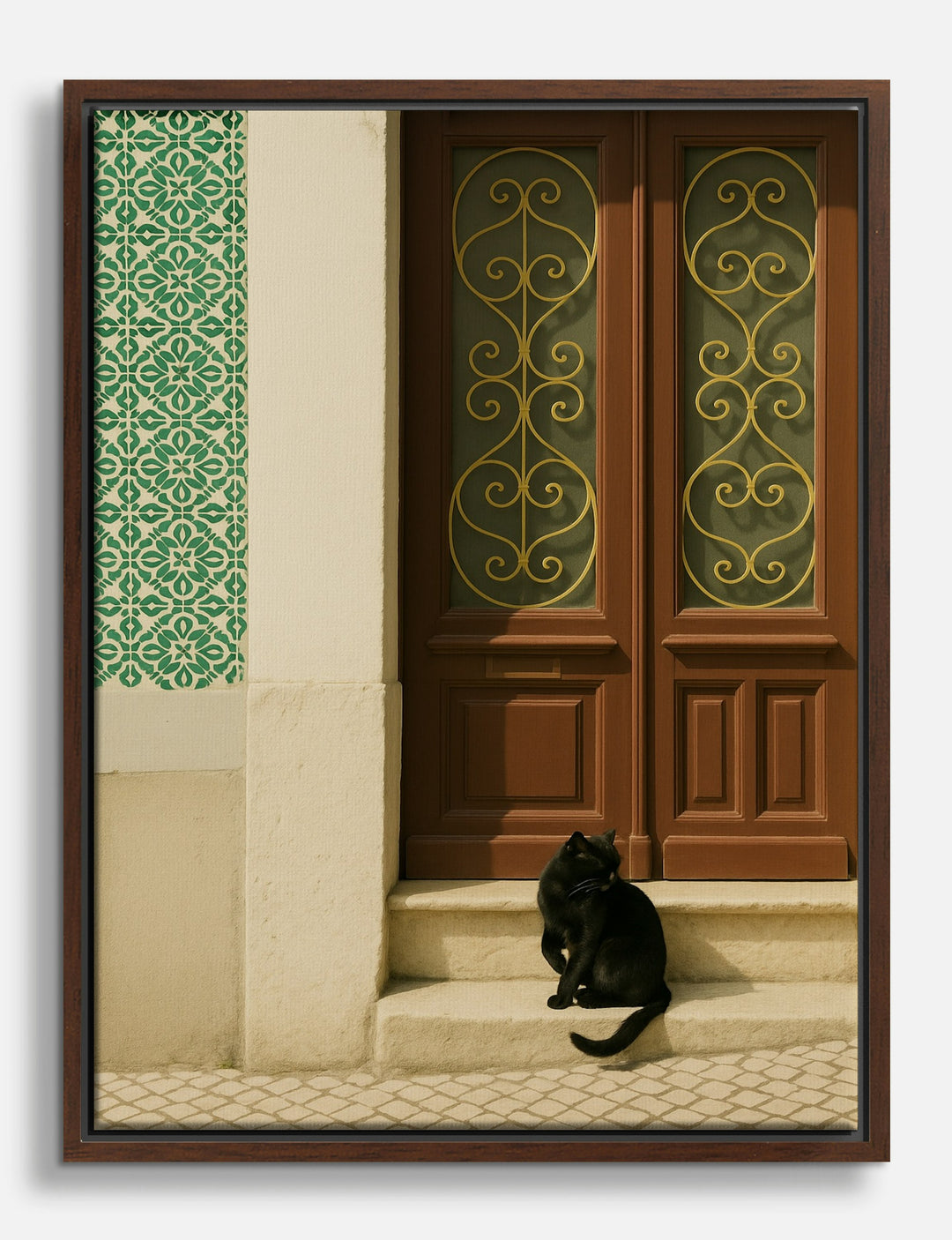 A sun-drenched Lisbon doorway, a sleek black cat, and a hint of wanderlust—this piece instantly transports you to quiet European streets and laid-back afternoons. The rich brown doors and patterned green tiles create a look that’s both timeless and refreshingly unique.