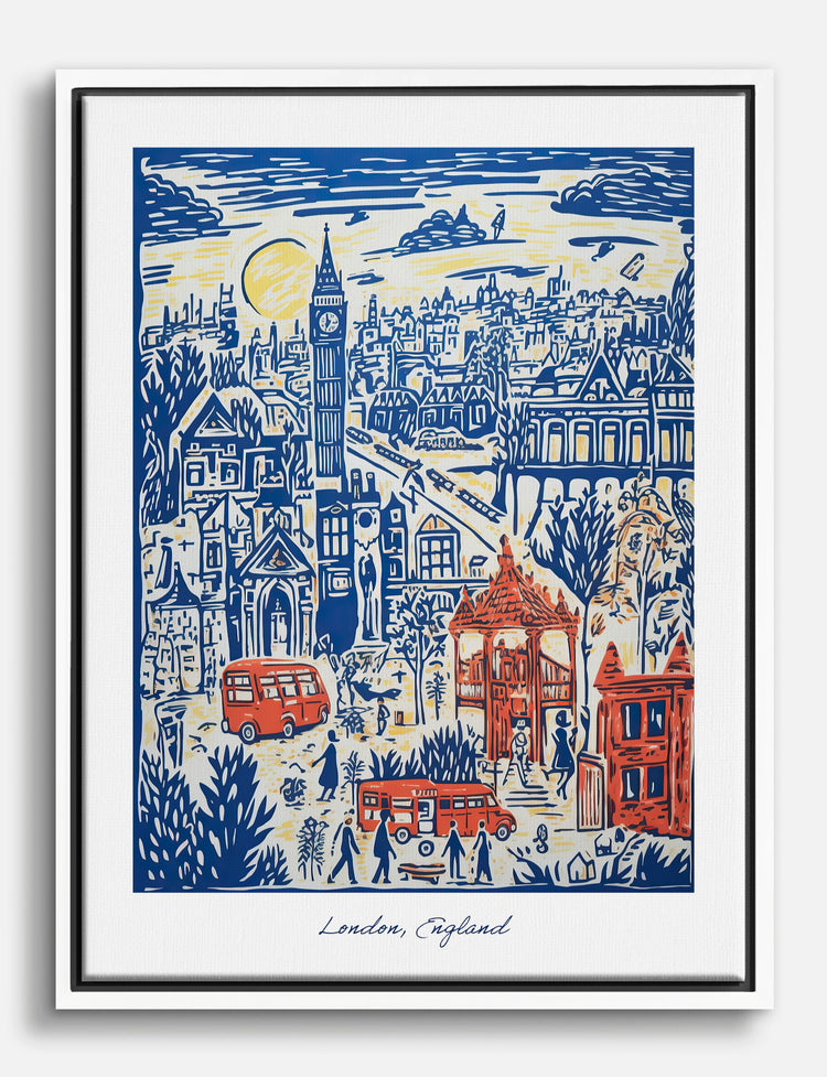 Step into the energy of London every time you walk by this lively scene. Playful linework in bold blue and warm red turns city icons—like double-decker buses and Big Ben—into a charming story right on your wall. Perfect for your living room or study, this piece pops against neutrals and adds a dash of cosmopolitan flair to any space. Youll love how it sparks conversation and brings a bit of British adventure home, all without breaking the bank.
