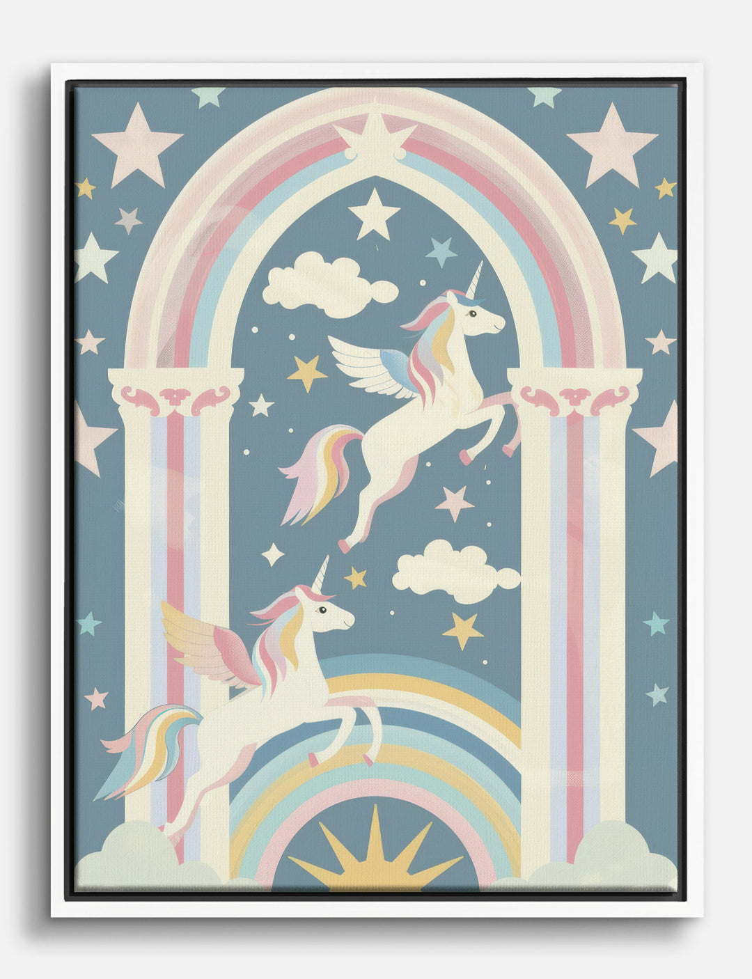 Step into a world where pastel rainbows and flying unicorns bring pure joy to your space. This enchanting piece instantly brightens any nursery or kids’ room, making every day feel a little more magical. Soft blues, pinks, and yellows play together to create a dreamy vibe that sparks imagination and wonder.