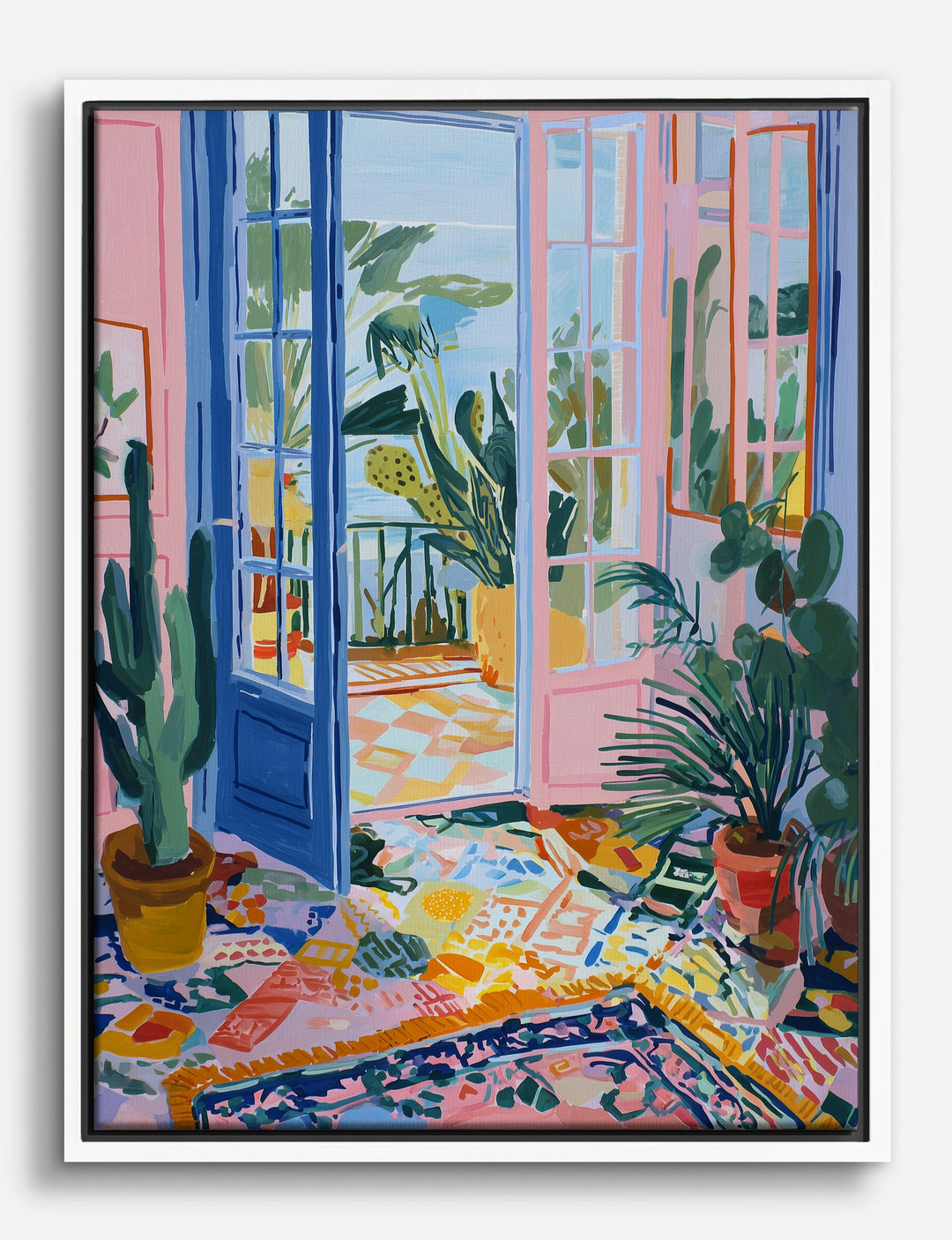 Step into a world where sunlight and color collide in the most joyful way. This Matisse-inspired scene bursts with bold blue doors, lush green plants, and a patchwork of vibrant patterns underfoot, all inviting you to bring a little vacation magic home. Wake up every morning to this easy-breezy vibe—perfect for brightening up your living room or adding a playful touch to your bedroom. You’ll love how the rainbow palette pops against both neutral and eclectic décor, instantly making your space feel more personal and alive. Why settle for ordinary walls when you can create a place that feels like your own creative escape? With this piece, transforming your home is effortless—and uniquely you.