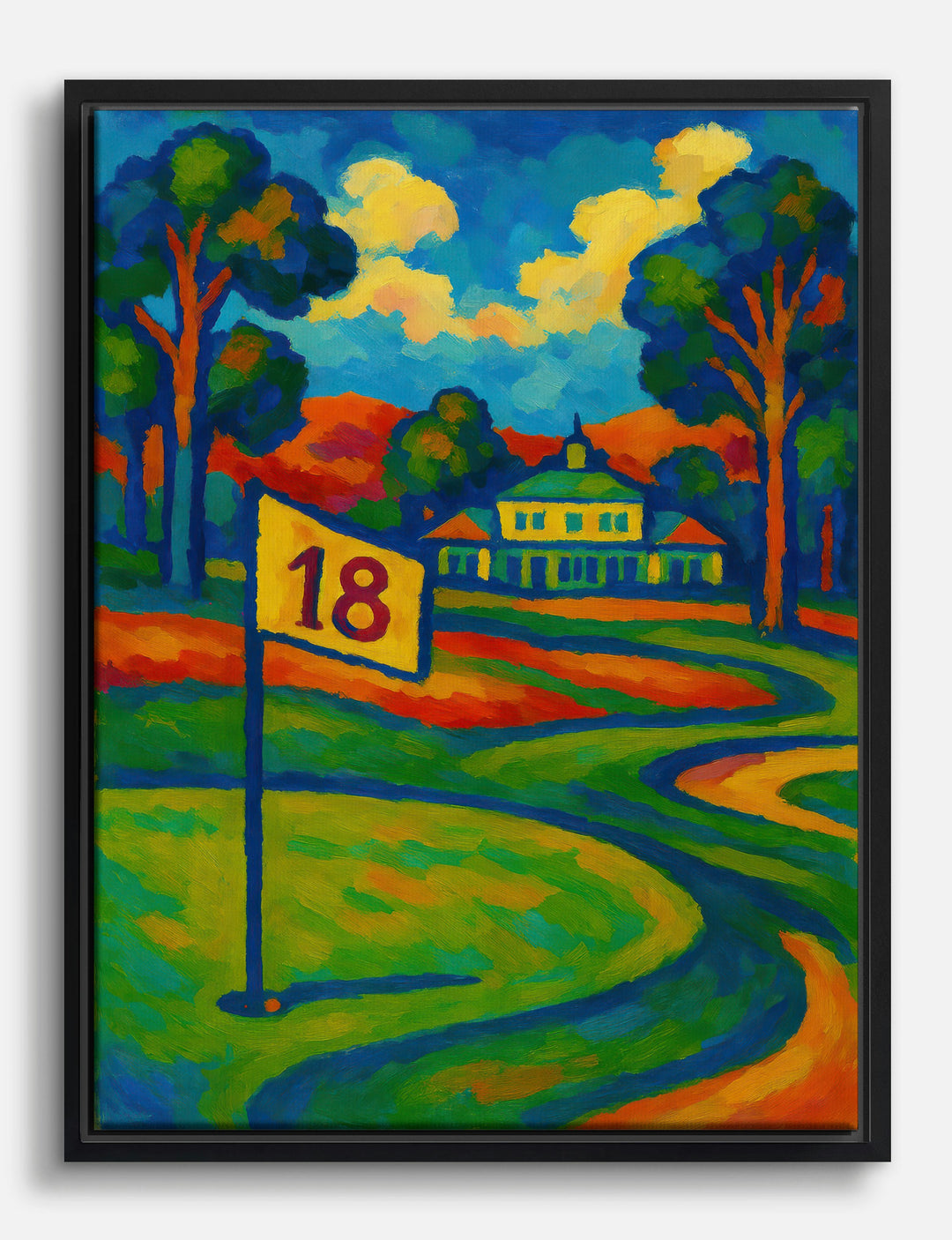 A bold splash of color meets the calm of the fairway in this Matisse-inspired piece. The iconic 18th hole flag pops against rolling greens, winding paths, and a charming clubhouse under dreamy skies. It’s a playful nod to leisure and style, perfect for anyone who loves a touch of sport with their sophistication.