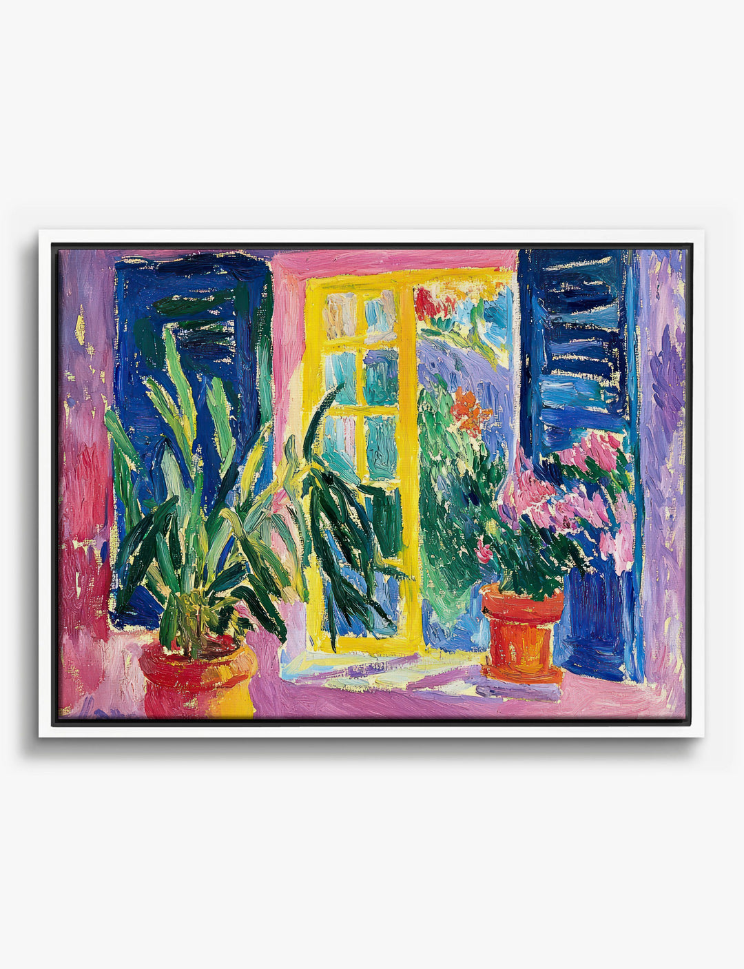 Bold color meets everyday magic in this Matisse-inspired window scene. Vivid blues, radiant yellows, and playful pinks pop with every glance, instantly energizing your favorite spot. Picture it above your sofa or as a cheerful burst in your bedroom—wherever you hang it, you’ll feel like sunlight and fresh air are flowing right in. The painterly brushstrokes and lush potted plants bring a touch of the Mediterranean, making your home feel both lively and welcoming. Mix it with modern decor for a playful twist, or let it stand out as a vibrant centerpiece. With Fab, it’s easy to let your walls reflect your unique style—no renovation required, just pure, joyful transformation.