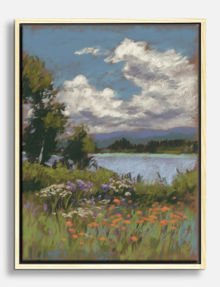 A sky full of cottony clouds and a lively burst of wildflowers bring instant calm and color to your space. This piece captures the simple magic of a summer meadow—where every glance feels like a breath of fresh air.