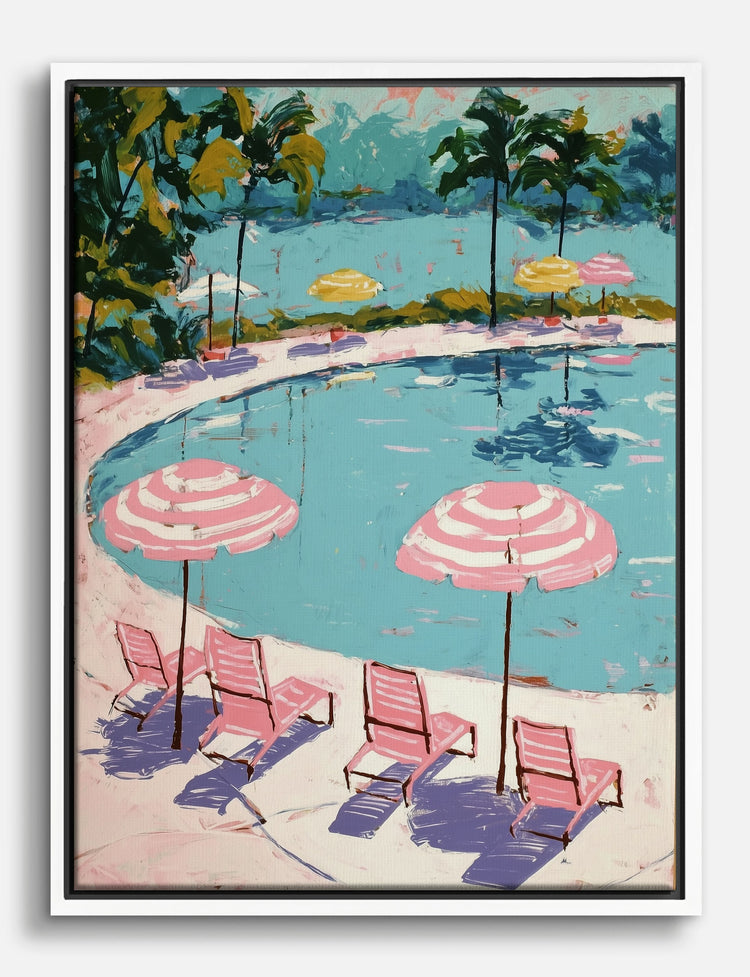 Sun-soaked afternoons and retro glam come together in this playful poolside scene. Pink-striped umbrellas and candy-colored loungers invite you to unwind, evoking the breezy charm of a Miami getaway—without ever leaving home.
