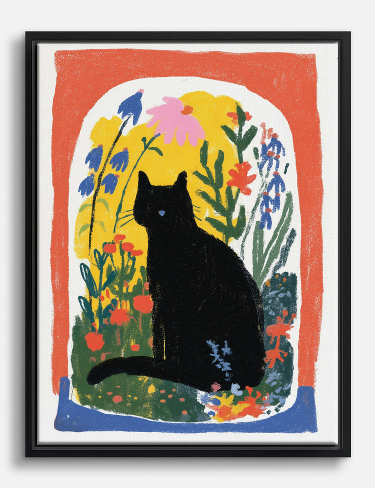 A mysterious black cat sits quietly among a riot of wildflowers, bringing a playful yet calming energy to your space. Let your walls tell a story of curiosity and comfort—this piece instantly makes any room feel more personal and alive.