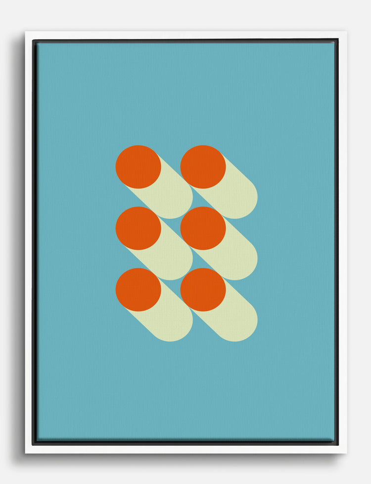 Bold simplicity, meet your new statement piece. Six crisp orange-and-cream forms pop against a dreamy blue backdrop, instantly energizing any space they touch. This is modern art for the style-setter who loves a playful twist.