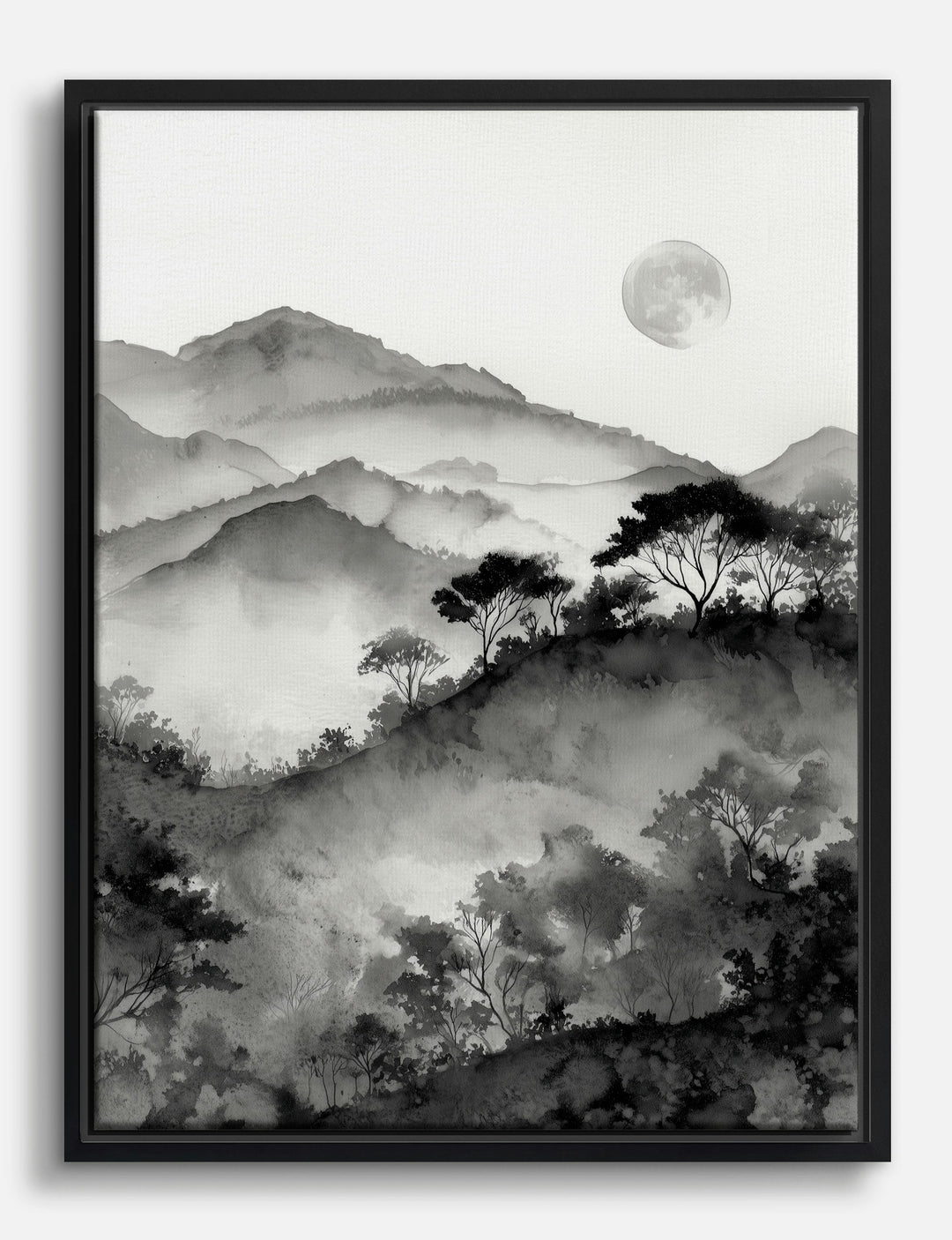 Let your walls breathe with the tranquil energy of misty mountains and moonlit skies. This piece captures that quiet, magical moment when dawn’s first light meets the lingering hush of night—perfect for anyone craving calm and clarity in their space.