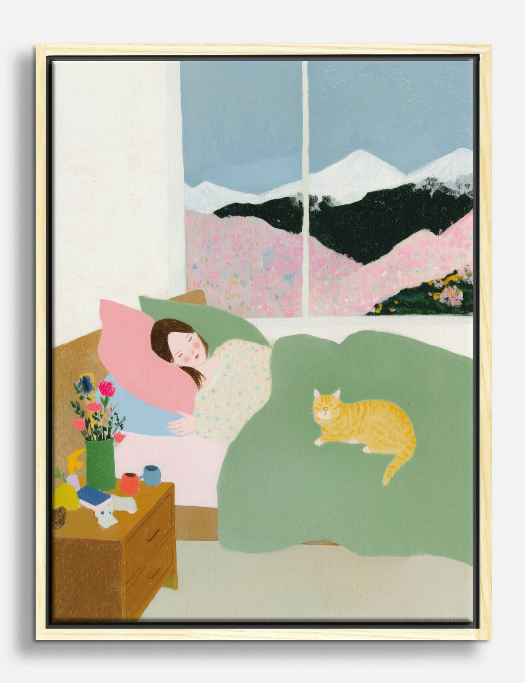 Soft morning light spills across a cozy bedroom, where serenity and comfort take center stage. This charming piece captures a peaceful moment—a girl gently resting, a loyal orange cat curled up nearby, and delicate mountains blooming outside the window. It’s a gentle reminder that your space can be a haven of warmth and quiet joy.