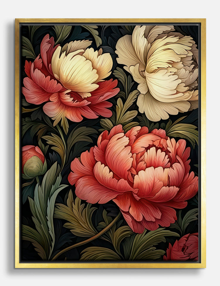 Bold blooms and vintage charm come together in this lush floral piece inspired by William Morris. With rich reds and creamy whites, these peonies pop against deep green leaves, instantly turning any wall into a statement of timeless style.