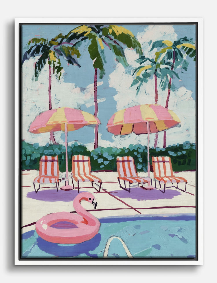 Sunshine, stripes, and a splash of pure fun—this piece brings the vacation vibe right to your walls. Pink umbrellas and playful lounge chairs instantly transport you to a retro-cool poolside, even on the greyest days.