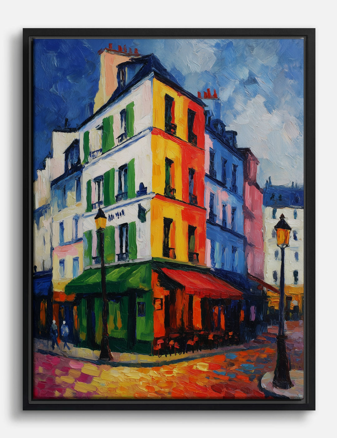 Bold color meets Parisian charm in this vibrant cityscape. Each brushstroke pops with energy, transforming a simple street corner into a scene that feels alive with possibility. Whether you’re craving a little everyday escape or just love the buzz of city life, this piece brings a joyful spark to any wall.